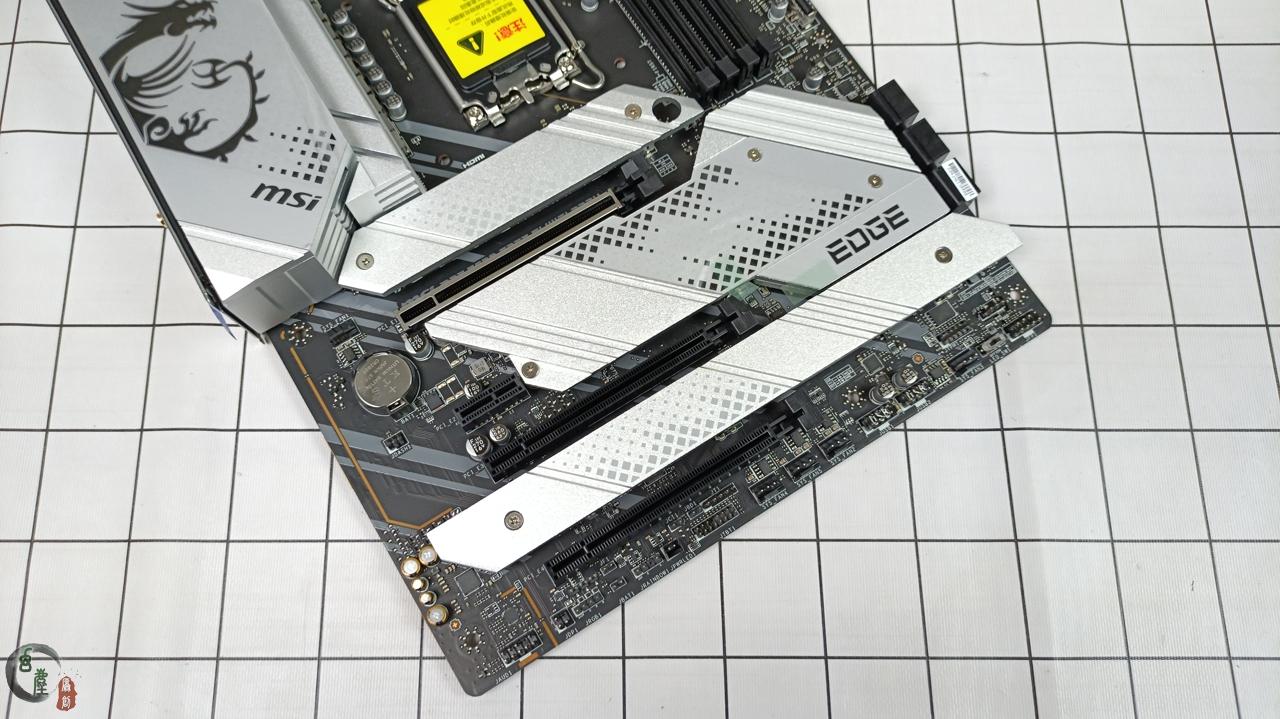 主板自带四个4.0的M.2接口,全部带有散热片,也就微星官方所说的M.2冰霜铠甲。其中靠近CPU处的M.2接口是PCI-E4.0 22110的,其它三个全是PCI-E4.0 2280的。靠近CPU的两根支持PCI-E 4.0 x4模式,通道带宽由CPU提供。下面一排的两根不仅支持PCI-E 4.0 x4模式,而且还兼容SATA模式,通道带宽由Z690芯片组。总得来说,四个全部支持PCI-E 4.0 x4模式,这方面,比B660主板可强太多了。