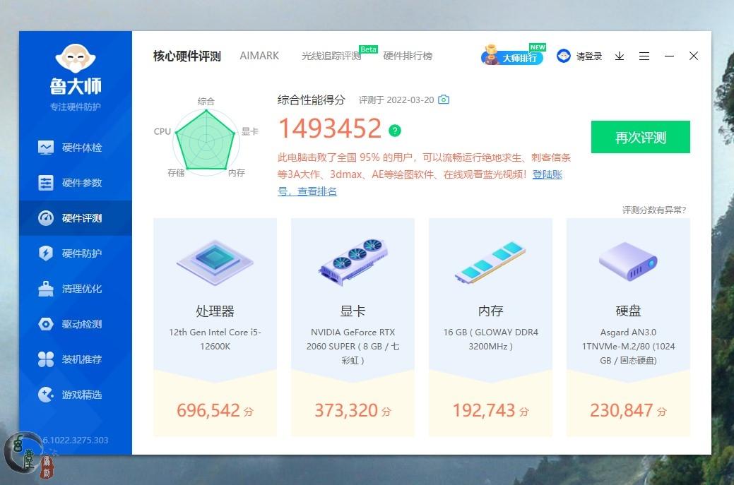鲁大师得分展示,这台主机的性能击败了全国95%的用户。