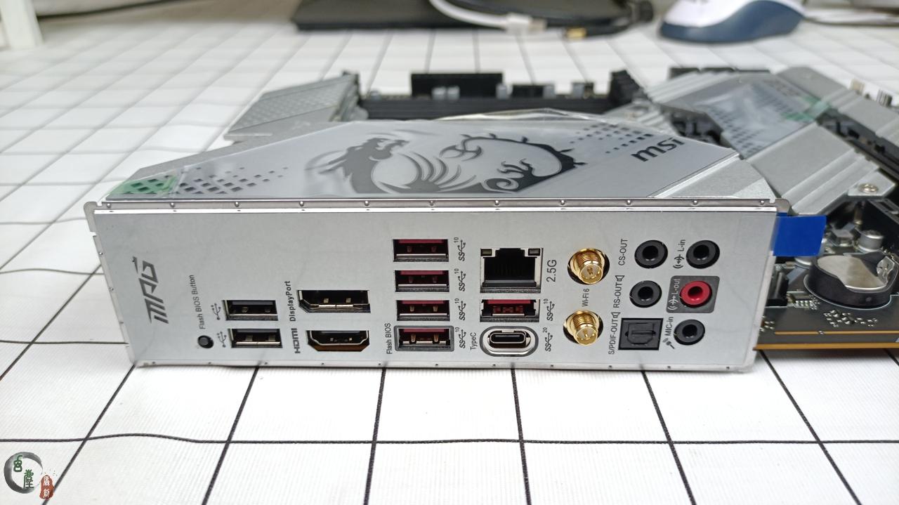 主板所有的一体式I/O挡板也采用了银白色设计,从而使主板的整体更加美观。I/O接口方面从左到右分别为,两个传统的USB2.0接口、一个DP和一个HDMI接口,五个USB3.2 Gen 2 10Gbps(Type-A),一个USB3.2 Gen 2x2 20Gbps(Type-C)接口,一个2.5G有线LAN口,一组WIFI天线接口,以及一组音频接口。