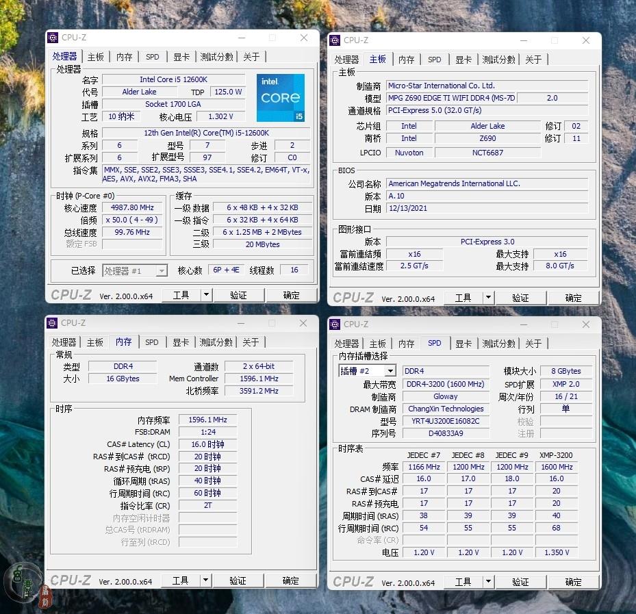 直接把12600K超至5.0G,CPU核心电压为1.3V,内存默认开启XMP,频率为3200MHz,时序为16-20-20-40。