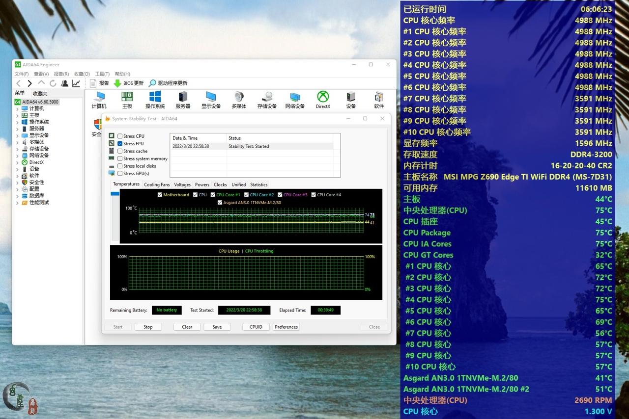 使用AIDA64软件对CPU进行拷机测试,运行40分,温度表现还是很不错的,一直没有超过80度。不得不说,微星(MSI) 寒霜K360 360一体式CPU水冷散热器还是很强的,用来压制超频后的12600K还是很不错的。