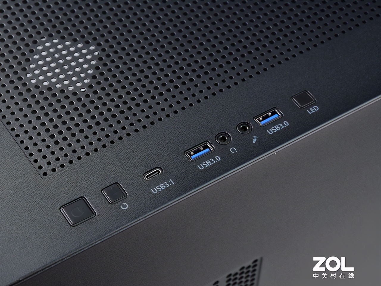 机箱的I/O区布局在顶部前半部分,依次设置了开机键,重启键,USB 3.1 Gen 2接口,2个USB 3.0接口,专门预留USB-C口,符合当下技术迭代趋势。此外,它还有一组音频接口和一个光效切换键,整体的功能,可以满足高速传输和多设备外接需求。