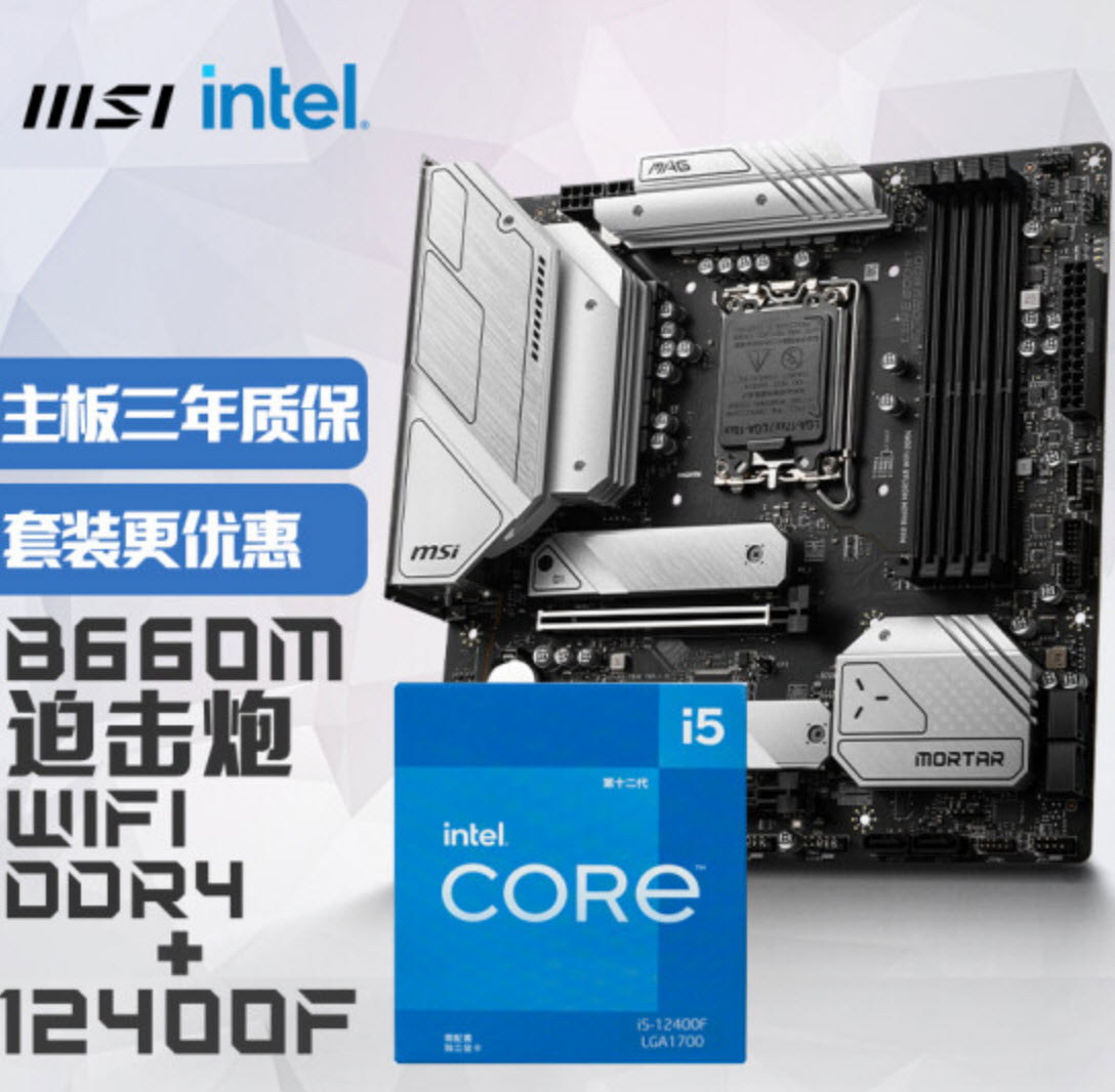 intel 12th Core i5-12400F和微星MAG B660M MORTAR WIFI DDR4的组合,哎呀!微星这款无线迫击炮主板确实不错就是这型号名实在是太长了!i5 12400F采用10nm工艺的Alder Lake-S架构,拥有6核12线程全性能核组建,基础频率2.5GHz,睿频高4.4GHz,搭配18MB三级缓存,TDP热设计功耗为65W。突出的特点就是性价比高。