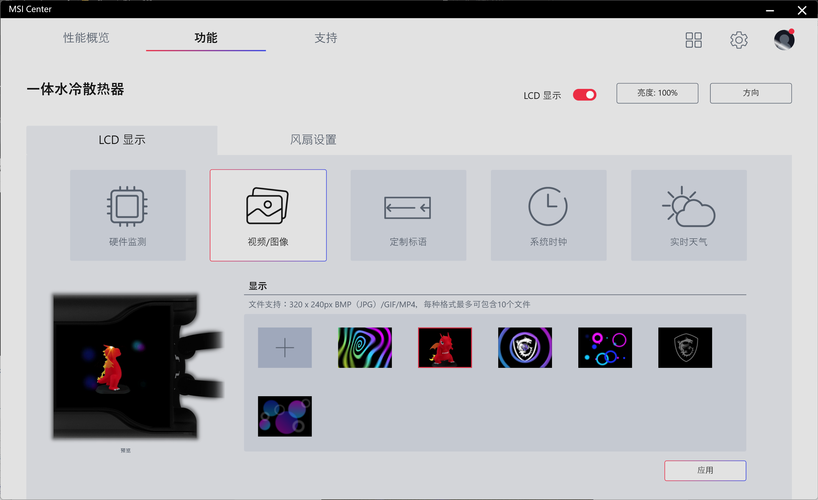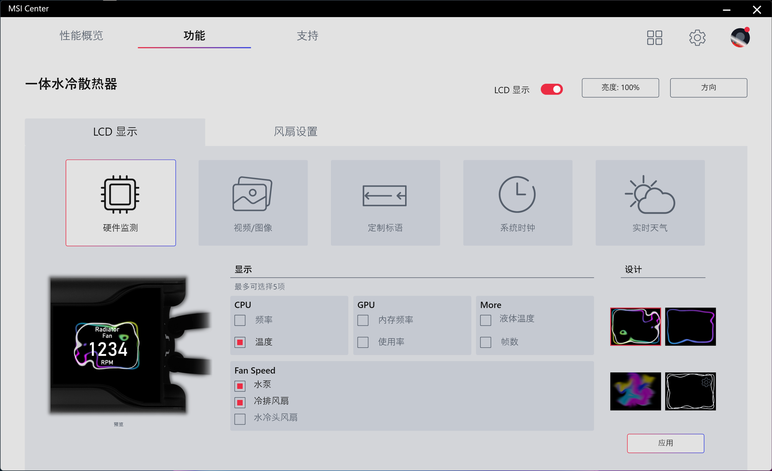 微星旗下的产品功能控制,目前是整合到MSI Center这款软件里面去了,包括这款战神S360,既然是搭载LCD屏幕,内容设置自然不可少,项硬件监测,可以实时轮转显示CPU、GPU、水冷等各种信息,同时也有四种边框样式可选。