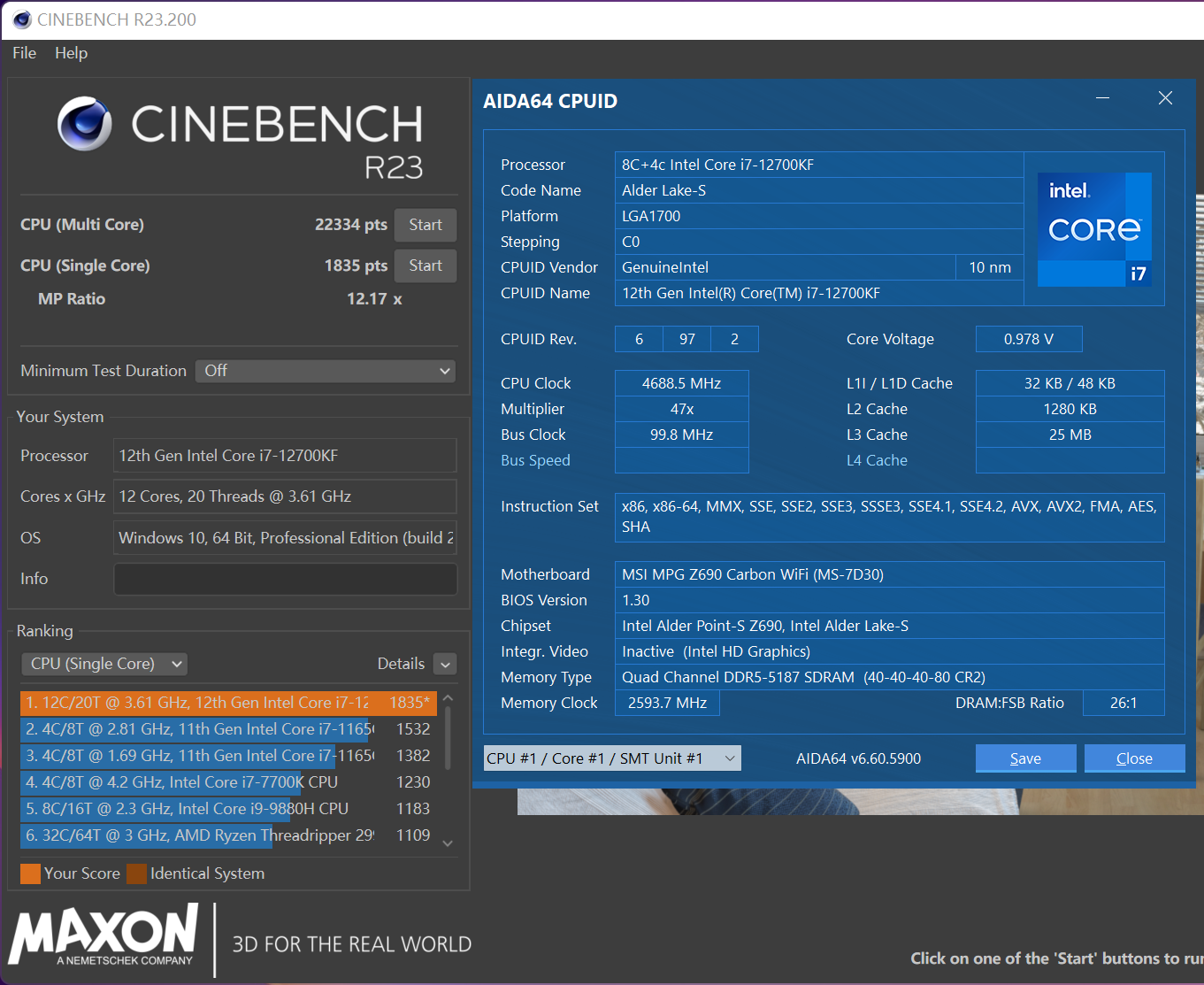 i7-12700KF默认CINEBENCH R23单核1835 pts,多核22334 pts