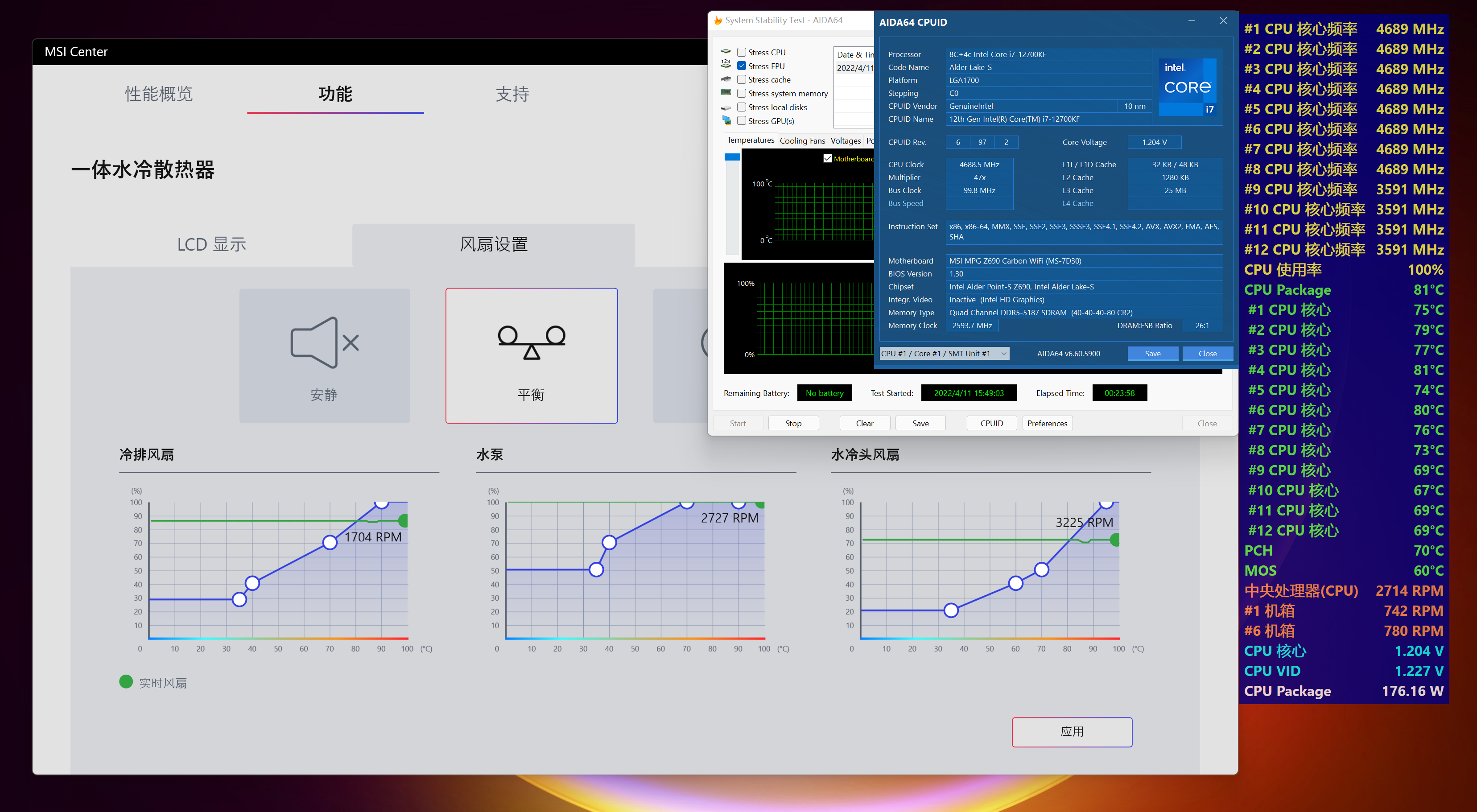 首先是默认状态水冷开启平衡模式,i7-12700KF使用AIDA64 FPU烤机20分钟之后 ,P核心稳定4.7Ghz,E核心稳定3.6Ghz,CPU核心电压为1.2V,CPU Package功耗176W,CPU Package温度81℃,P核心平均温度76.8℃,E核心平均温度68.5℃,主板PCH和MOS温度分别是70℃和60℃,平衡模式下冷排风扇没有达到满速,但实测游戏模式温度也差不多。