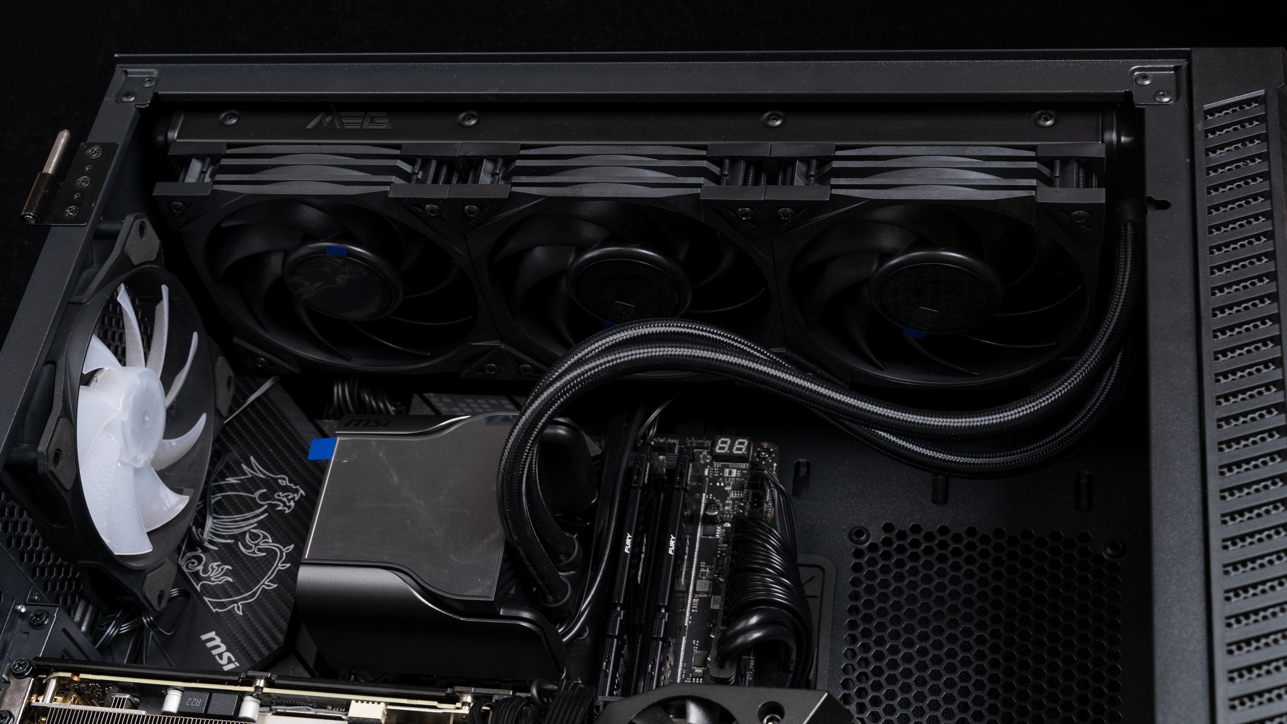 冷排采用三枚微星MEG SILENT GALE P12风扇,银黑相间无RGB灯光设计,采用Hypro-dynamic Bearing轴承,专注性能和低噪声,四角均拥有防震垫,风扇大转速2000RPM,也支持0转风扇模式。
