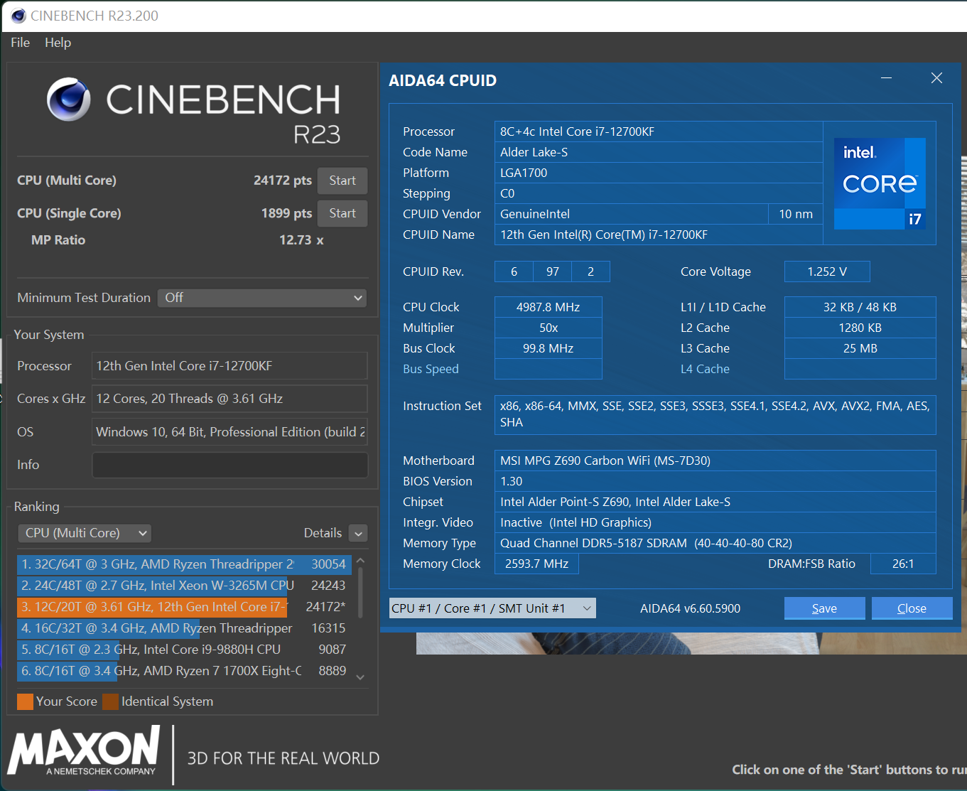 i7-12700KF超频CINEBENCH R23单核1899 pts,多核24172 pts,单核性能提升3.4%,多核性能提升8.2%