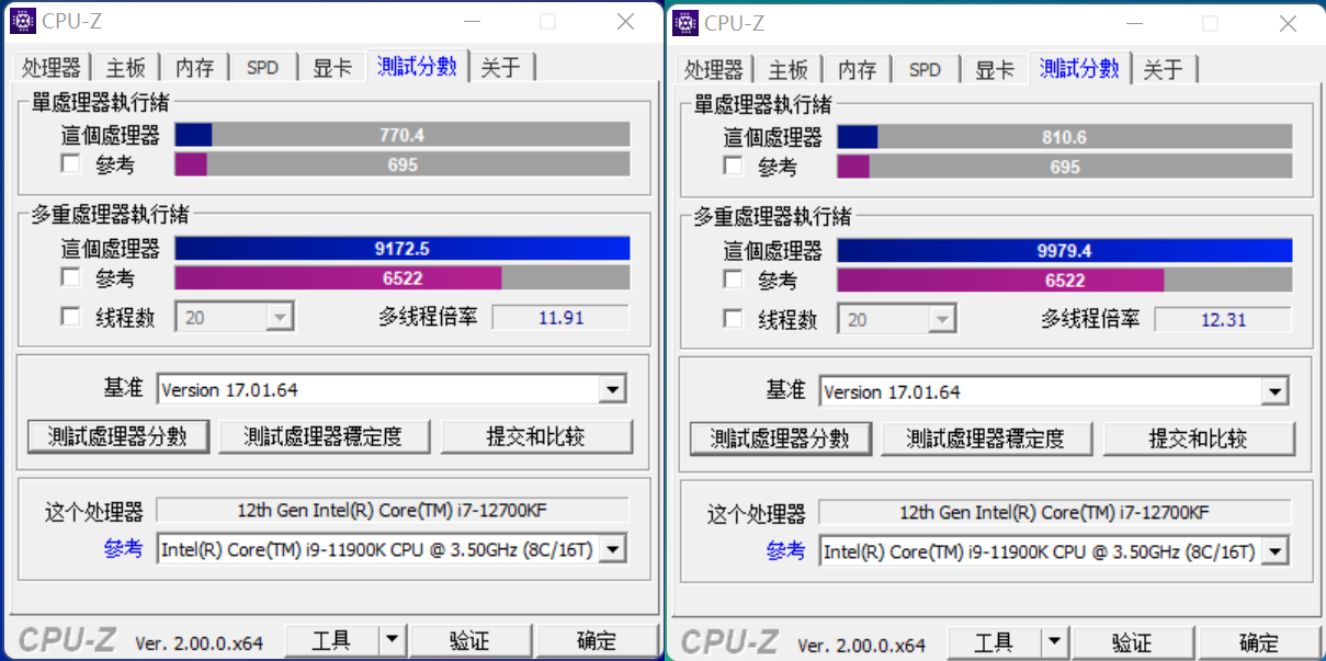 CPU-Z跑分,i7-12700KF默认单核770,多核9172,超频状态单核810,多核9979,超频之后距离i9-12900KF还有点差距,但是相比默认提升不少了。