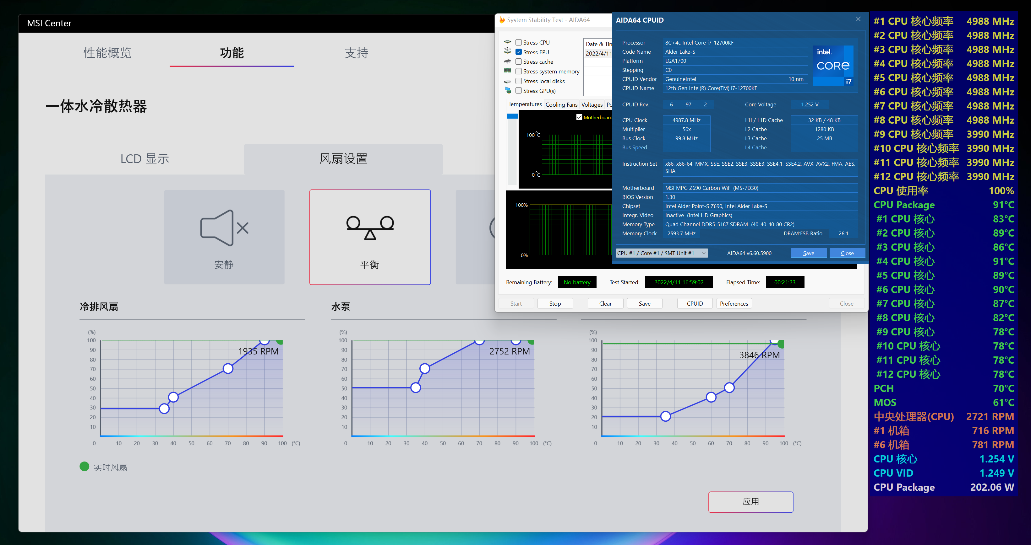 超频状态开启平衡模式烤机,P核心稳定5.0Ghz,E核心稳定4.0Ghz,CPU核心电压为1.25V,CPU Package功耗202W,CPU Package温度91℃,P核心平均温度87.1℃,E核心平均温度78℃,主板PCH和MOS温度分别是70℃和61℃,主板几乎和默认时表现一致,此时水冷就达到满负载状态了,这种散热表现还算不错,毕竟环境室温也比较高,开启空调还能再进一步降温。