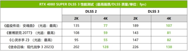 在开启DLSS 3之后,多款游戏的4K分辨率性能得到了大幅提升,原本在DLSS 2质量挡下不流畅的游戏,也将帧率提升到了80fps以上,实现了流畅的游戏画面。比如《瘟疫传说:安魂曲》的画面帧率从77fps提升到了107fps,提升幅度在38%以上;《赛博朋克2077》也从59fps提升到了81fps,提升幅度在37%;而《心灵杀手2》的画面平均帧率更是从55fps来到了82fps,实现了将近50%的性能提升,性能提升了不止一个档次。
