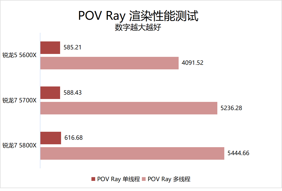 在创作工作中更注重的渲染能力方面,AMD 锐龙 7 5700X 也延续了基准测试中的表现,在众多项目与 AMD 锐龙 7 5800X 不分伯仲,多出来的 2T 核心优势,相比 AMD 锐龙 7 5600X 有明显的性能提升。