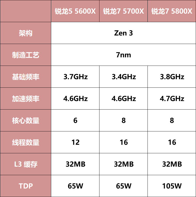 AMD 锐龙 7 5700X 延续了锐龙 5000 系列的 Zen 3 架构、代号“Vermeer” ,采用 7nm FinFET 制造工艺,主频 3.4GHz,频率 4.6GHz,具备 8 个核心以及 16 个线程。它的整体规格相比同门师兄弟 5800X 仅在频率上略逊一筹,而与低一级的 5600X 做对比时,又多了两个核心和 4 个线程。对于同时追求高主频和多核心且没有那么多预算的同学来说,5700X 地填补了空白。