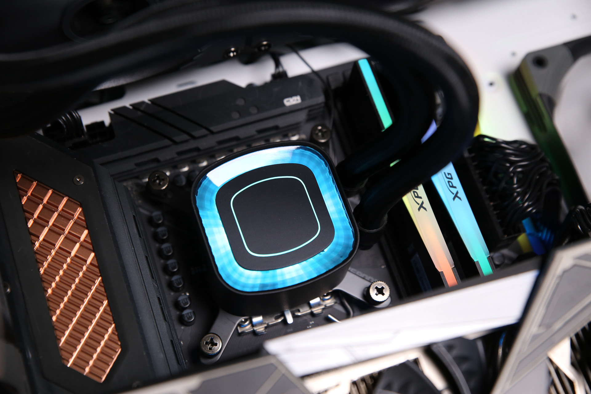 虽然爱国者冰魄W360并没有采用时下的RGB灯光,但是它的冷头依然是有蓝色的LED灯,这个灯光是采用折射方式形成的,所以眼睛直视的时候也不会有刺眼的问题出现。在冷头的旁边,我们还可以看到一个控制灯光点亮方式的按钮,使用起来还是挺方便的。