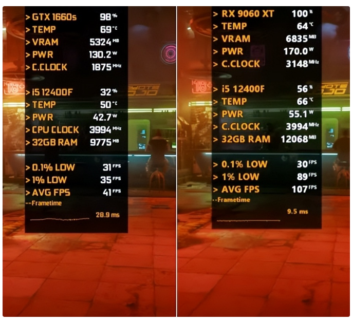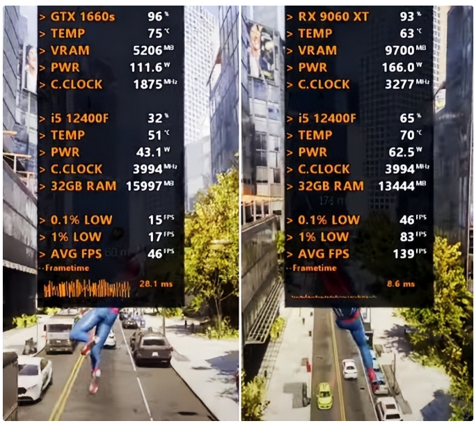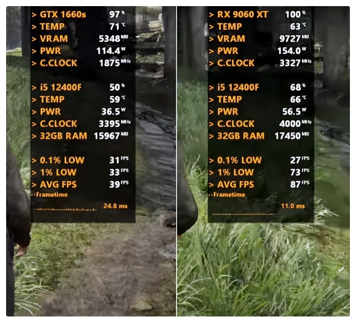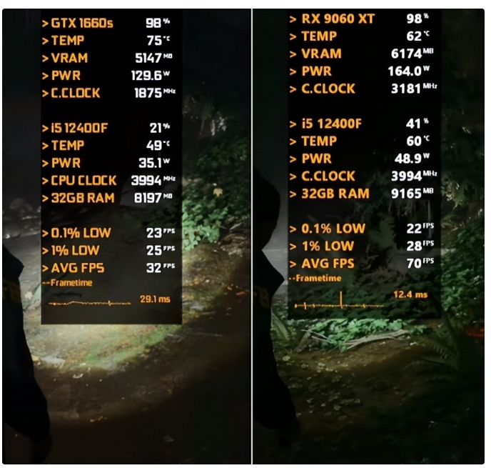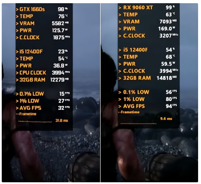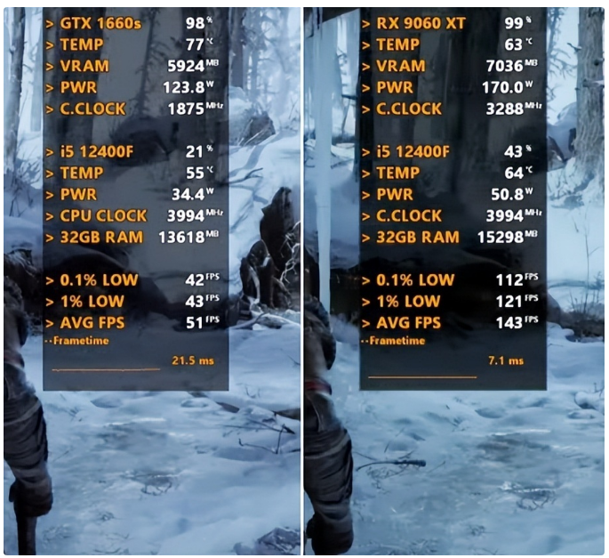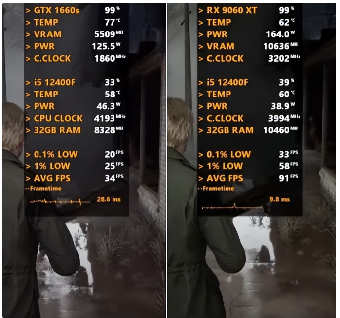 以下将分别测试七款游戏,均采用1080P画质模式,以下系列图片中左边代表GeForce GTX 1660 SUPER 6GB平台,右边代表Radeon RX 9060 XT 16GB平台。