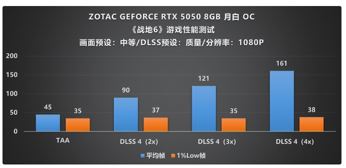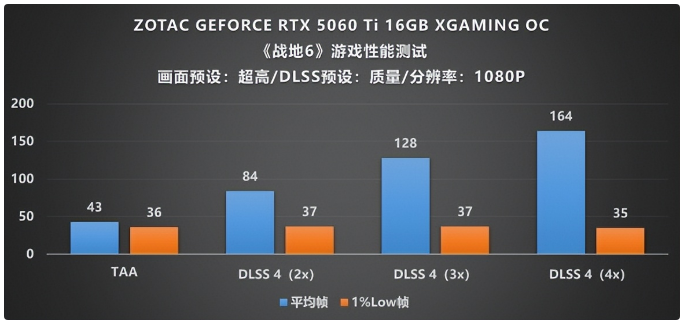 作为5060的加强版5060Ti,其基础实力相比于5060应该提升了不少,让我们来看看它的表现吧。在原生渲染的状态下,运行《战地6》的帧数只有43帧,虽然比5060好些但运行依然略有卡顿。当开启DLSS 4,调节至2X,帧数便已翻倍,达到84帧,可流畅运行,继续调节至3X,这次直接一跃至128帧,爽玩已不在话下,等到4X开启时,在1080P的分辨率下帧率竟达到164帧,远远超过了我们预期,DLSS 4竟强悍如斯!当然,另一项数据——1%Low帧也比5060要略好一点,都超过了35帧,符合我们的心理预期。