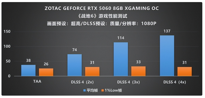 作为索泰的甜品级显卡,我们设定用1080P进行测试。通过测试结果我们不难看出,在不开启DLSS的时候,平均帧数只有可怜的38帧,连基础的流畅运行也颇具难度,这时候我们打开DLSS 4 ,档位调至2X,可以惊喜地看到帧率几乎翻倍,来到了74帧,流畅运行已毫无压力,随之我们继续调节DLSS 4至3X,平均帧率又大幅上升至114帧,游玩体验可以说是丝滑无阻,不过这还不是DLSS的极限,当DLSS 4调整至4X时,帧数又上涨至137帧!综上可以看出,从关闭DLSS 4到开启DLSS 4(4X),每一档的帧数稳步上升三四十帧,最高帧相比于最低最低帧提升大约4倍!除此之外,这其中的每一档的1%Low帧都稳定维持在30帧作用徘徊,对于流畅游玩并无任何影响。
