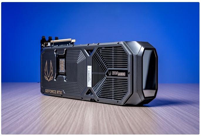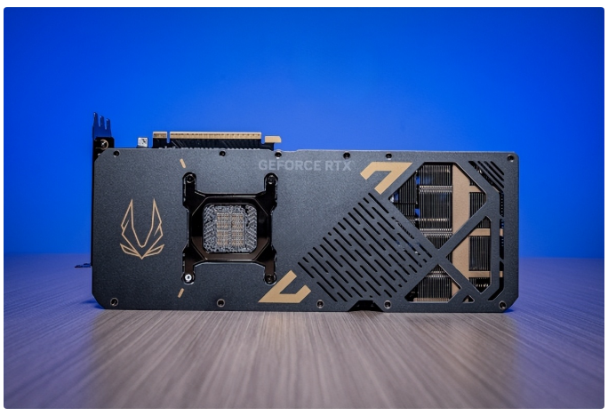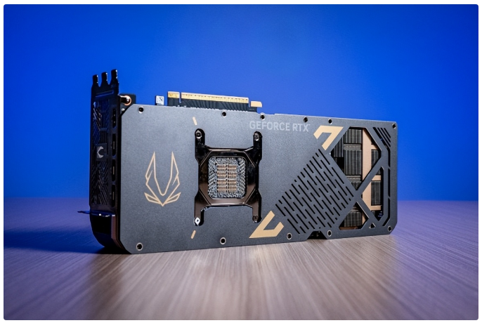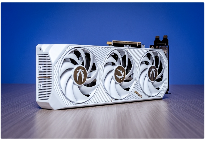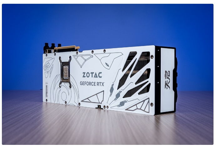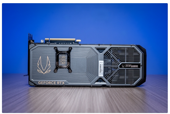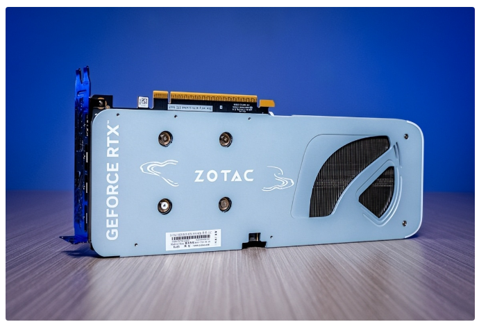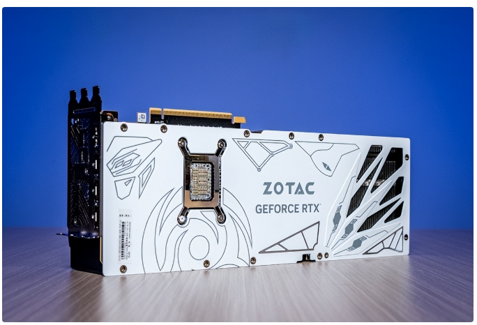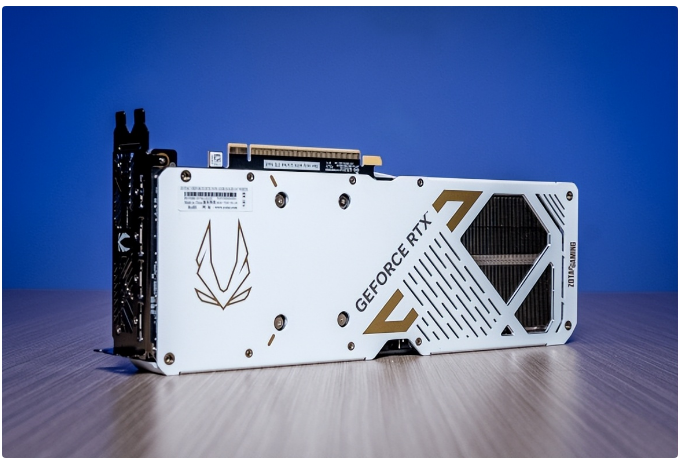与此同时,显卡的背板采用金属镂空的雕花设计,背板印有GEFORCE RTX以及ZOTAC的银色logo,为显卡增添一丝活泼俏皮,也能够起到辅助散热的作用。此外,纯白的机身非常适合搭配白色的海景房机箱,这对于注重机箱颜值的小伙伴来说或许是个福音,我们实测装机的装机效果也确实不错。
