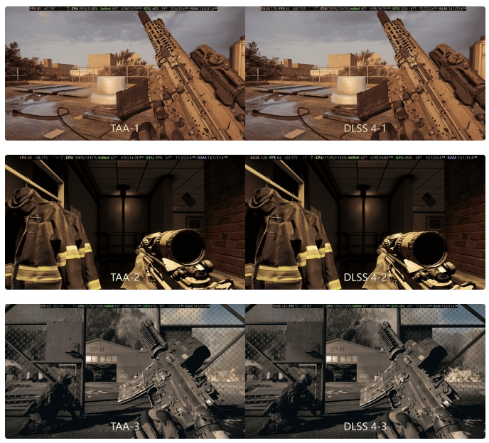 与此同时我们也截取了游戏中关闭/开启DLSS 4(2x)的游戏画面来做对比:从上方对比图可以看出,在开启DLSS 4的情况下,无论是游戏的平均帧率还是画面清晰度,对比仅使用TAA的原生渲染都有明显进步,帧率获得了超100%的提升,同时游戏中场景的纹理,人物、枪械的建模也更加清晰。