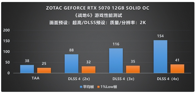 考虑RTX 5070的中端产品定位,1080P对其而言实在不够看,所以我们直接测2K分辨率下的性能表现。从测试中我们看出,在原生渲染的模式下,平均帧率维持在38,游玩体验较为卡顿,当开启DLSS 4(2X)后帧率从38帧增长到88帧,增长幅度高达131.57%.。当开启DLSS 4(3X)后帧率也增加了28帧,直接拉满到4X后,帧率又大幅上涨38帧,达到了154帧的峰值,完美实现了电竞级别的丝滑流畅体验。由此可见,想《战地6》这种画质精美的枪战游戏,索泰RTX 5070 SOLID OC依旧能够实现完美运行,性能表现相当不俗。