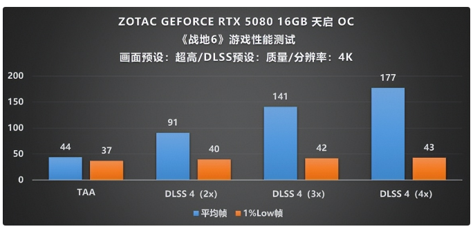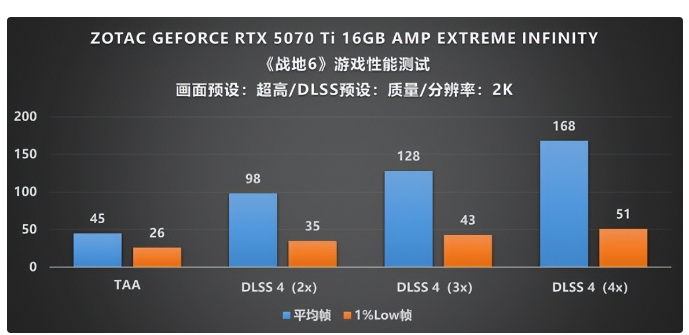 作为索泰产品线中的旗舰AMP家族的一员,其实力依然不容小觑。在2K分辨率,预设为超高的情况下,原生渲染帧率可达45帧,此时勉强能够流畅运行,在打开DLSS 4的情况下,档位调至2X,帧数便达到98帧,相比于原生渲染时增幅达到117.77%,调节至3X时平均帧率增加30,达到128帧,对于单人战役来说已经称得上是丝滑流畅,不过这还不是极限,在打开DLSS 4 (4X)的状态下平均帧率更是达到168,增幅也不小,流畅运行《战地6》简直不在话下。