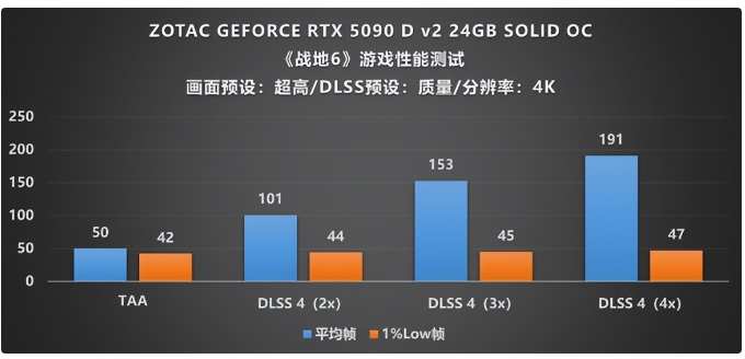 最后测试的终极BOSS是索泰 GEFORCE RTX 5090D v2 24GB SOLID OC,作为旗舰级显卡,自然是这七款里最强的那一个,经过测试,得到的结论也确实如此。在4K分辨率,画面预设为超高的背景下,通过原生渲染,运行单人战役的平均帧率为50帧,流畅运行4K画质下的《战地6》已基本实现,当开启DLSS 4后,在2X时平均帧率便已过百,达到101帧,在开启3X时,平均帧率又增长了一半,达到153帧,这时丝滑游玩已无障碍,最后的4X状态下的DLSS 4更是锦上添花,使平均帧率达到了巅峰的191帧,只要搭配一台高刷4K显示器,就能享受丝滑如德芙的超清画面,游戏体验直接拉满!