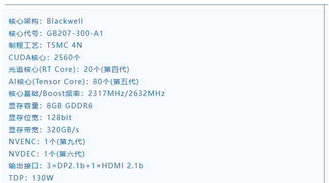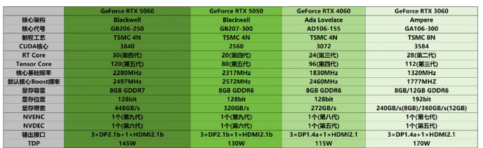 配置方面,根据详细的规格对比表,我们可以看到RTX 5050 GPU配置了2560个CUDA核心,每组GPC包含4个TPC,组成了12组TPC+20组SM单元的规格,在硬件规格的纸面配置上相比RTX 5060约有33%的差距,相比RTX 4060也有20%左右的规格差距。从CUDA核心数量来看,如果RTX 5050是100%的话,RTX 5060为150%,RTX 4060为120%,而RTX 3060则为140%,属于非常“入门”的配置,其目标应该是用于迭代前两代的入门级老旧游戏显卡,如RTX 3050、RTX 2060甚至是GTX 1650这样的“老古董”。