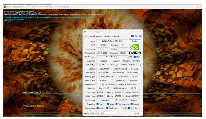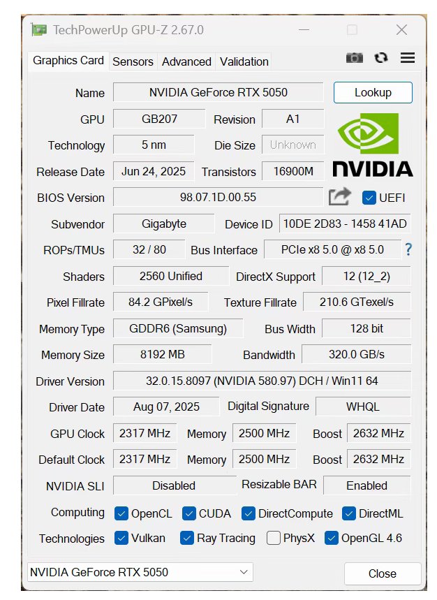 根据GPU-Z,我们能够看到技嘉GeForce RTX 5050 GAMING OC魔鹰8GB搭载的GPU核心Boost频率达到了2632MHz,较NVIDIA指导建议频率高出60MHz。那么在预超频的状态下,技嘉GeForce RTX 5050 GAMING OC魔鹰8GB又会给我们交上怎样的答卷呢?我们接着往下看。