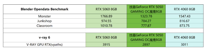 在图像与模型渲染方面,由于SM单元数量不及RTX 4060 8GB,因此技嘉GeForce RTX 5050 GAMING OC魔鹰8GB在该环节的表现略微落后一点,但二者差距并没有拉开太大——在Blender Opendata Benchmark以及V-RAY GPU RTX模式测试中,后者平均落后前者8%。