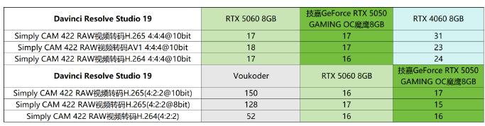 值得一提的是,由于Blackwell架构升级了新一代编解码器,并且技嘉GeForce RTX 5050 GAMING OC魔鹰8GB的编解码器数量与RTX 5060 8GB相同,因此其在传统的4:4:4视频转码方面与RTX 5060 8GB接近,并且远远领先于RTX 4060 8GB。不仅如此,由于新一代编解码器还支持4:2:2专业格式转码,因此在应对此类视频的转码时,技嘉GeForce RTX 5050 GAMING OC魔鹰8GB拥有较软件转码更出色的效率,能够大幅压缩时间成本。