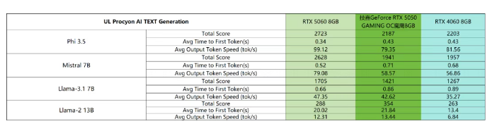在AIGC方面,技嘉GeForce RTX 5050 GAMING OC魔鹰8GB的实际性能表现与RTX 4060 8GB互有胜负,但整体来看,技嘉GeForce RTX 5050 GAMING OC魔鹰8GB会有略微的优势。同时,这款显卡在应对Mistral 7B、Llama-3.1 7B的AI文本测试模型时,能够分别带来58.57token/s以及42.62token/s的词元输出能力,表现值得肯定。当然,受限于显存容量的限制,技嘉GeForce RTX 5050 GAMING OC魔鹰8GB在13B模型测试方面的表现不及预期,因此技嘉GeForce RTX 5050 GAMING OC魔鹰8GB在游戏之余,能够帮助用户部署本地轻量化模型。