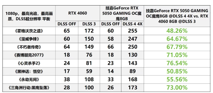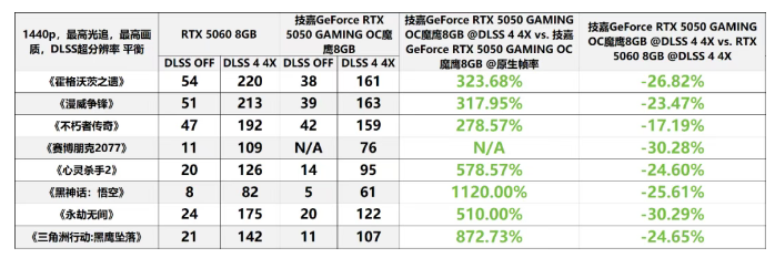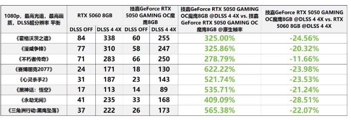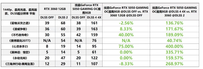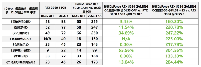 从该环节来看,仅能开启DLSS 2的RTX 3060 12GB无法在《黑神话:悟空》《心灵杀手2》《三角洲行动:黑鹰坠落》等游戏中实现相对流畅的帧率。在此情形下,与能够启用DLSS 4 4X的技嘉GeForce RTX 5050 GAMING OC魔鹰8GB相比较,RTX 3060 12GB可谓“自不量力”。根据实际帧率数据来看,开启DLSS 4 4X的技嘉GeForce RTX 5050 GAMING OC魔鹰8GB相较于开启DLSS 2的RTX 3060 12GB,在1080p、1440p分辨率下的平均帧率提升幅度分别达到了213%、224%。