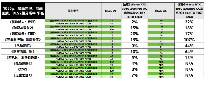 在本次针对十款游戏的实测环节,我们确保所有游戏均在最高画质设置下进行,并对具备光线追踪技术的游戏启用了超高光追效果。同时,对于支持DLSS技术的游戏,我们采取了DLSS@平衡模式进行深入测试。在1080p分辨率下,我们发现,关闭DLSS功能时,技嘉GeForce RTX 5050 GAMING OC魔鹰8GB显卡相较于RTX 3060显卡平均领先幅度维持在9%左右。而在启用DLSS功能的情况下,得益于帧生成的加持,技嘉GeForce RTX 5050 GAMING OC魔鹰8GB显卡与仅支持DLSS 2的RTX 3060显卡之间的性能差距进一步扩大,平均领先幅度达到34%。