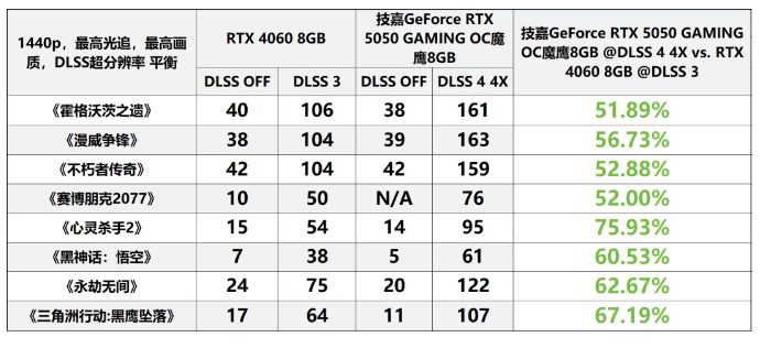 当将对比对象替换为RTX 4060 8GB后,得益于DLSS 4 4X所带来的显著帧率提升,技嘉GeForce RTX 5050 GAMING OC魔鹰8GB在该环节测试的8款游戏中,能够对仅可开启DLSS 3的RTX 4060形成绝对优势——在1440p分辨率下,平均帧率领先幅度可达60%;在1080p分辨率下,平均帧率领先幅度可达63%。