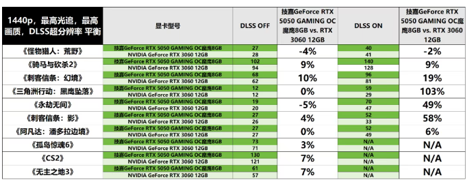 当将画面分辨率提升至1440p后,能够观察到在未启用DLSS的情形下,技嘉GeForce RTX 5050 GAMING OC魔鹰8GB在部分游戏中的表现稍逊于RTX 3060。基于测试经验,我们认为这是由于此类游戏在开启光追并设置为最高画质时,对显存容量存在较高依赖,而拥有12GB显存的RTX 3060在这部分测试中更具优势。不过,从整体性能来看,技嘉GeForce RTX 5050 GAMING OC魔鹰8GB仍显著领先于RTX 3060。而在开启DLSS@平衡模式以及DLSS帧生成后,技嘉GeForce RTX 5050 GAMING OC魔鹰8GB平均领先RTX 3060的幅度可达40%以上。以上测试结果表明,采用新架构的技嘉GeForce RTX 5050 GAMING OC魔鹰8GB显卡在高画质游戏体验中,即便不借助DLSS 4,也能够超越在显存方面具有明显优势的RTX 3060。