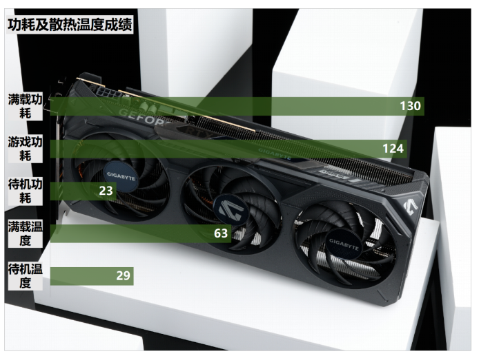 另外我们还记录了技嘉GeForce RTX 5050 GAMING OC魔鹰8GB在1080p游戏状态(测试游戏为《赛博朋克2077》,并且开启超高光追效果与最高画质)下以及烤机时的功耗——能够看到其于游戏时的功耗释放为124W,于烤机时的满载功耗为130W,与TDP的标准相符合。