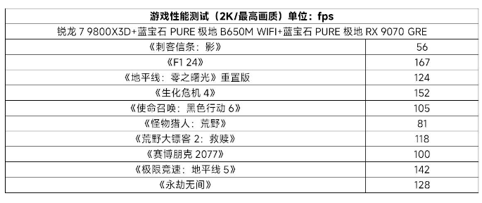 在大家最关心的游戏性能方面,蓝宝石PURE极地B650M WIFI搭配锐龙7 9800X3D处理器和蓝宝石PURE极地RX 9070 GRE显卡拥有非常不错的性能表现。从测试来看,在2K极限画质下,整套配置可以提供非常流畅的平均帧率,说明蓝宝石PURE极地B650M WIFI可以充分发挥锐龙7 9800X3D和蓝宝石PURE极地RX 9070 GRE显卡的性能。