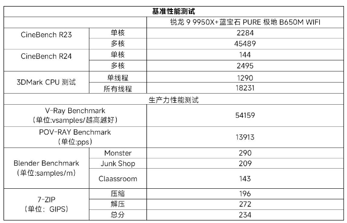 处理器基准性能测试中,蓝宝石PURE极地B650M WIFI搭配AMD锐龙9 9950X处理器在Cinebench R23和Cinebench R24中都展现出了强悍的性能。而在生产力性能方面,AMD锐龙9 9950X在各种生产力软件中的成绩也非常优秀,其成绩和搭配X870主板时几乎相当。