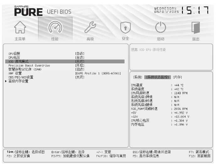 在进阶模式下,这款主板的BIOS则能够解锁更多的操作,性能页面中的可玩性就更多了,CPU超频、电压调整、PBO设置等应有尽有。如果使用X3D系列的处理器,BIOS中还会有X3D游戏模式的选项,开启后能够在部分游戏中获得更出色的性能释放。