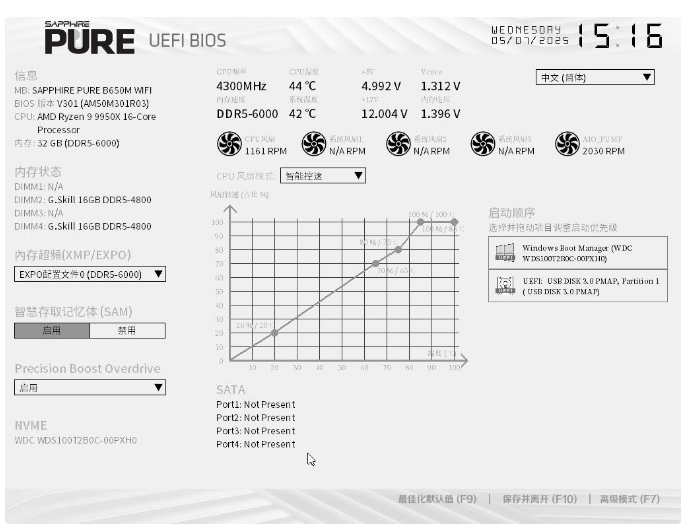 在BIOS体验方面,蓝宝石PURE极地B650M WIFI的BIOS界面非常简约,同时PURE系列主板的BIOS还有专属自己的UI设计。黑白主题的配色,各种设置选项和参数一目了然。实用性方面,简易模式下就能对EXPO、PBO等常用功能进行调整,对小白玩家十分友好。