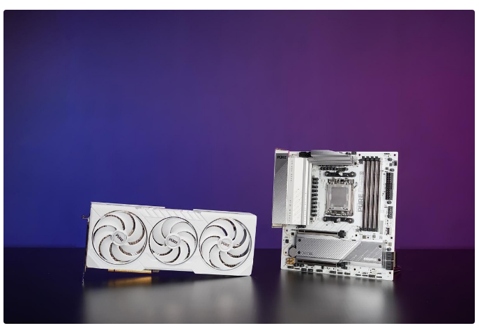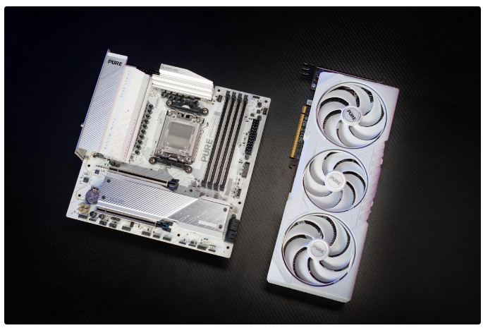 显卡方面,我们选择了最新的蓝宝石PURE极地RX 9070 GRE 12G D6 OC。蓝宝石PURE极地RX 9070 GRE采用了该系列的全新外观设计,极地白配色特别适合搭配蓝宝石PURE极地B650M WIFI主板打造高颜值的纯白主机。一体式框架设计的卡身上采用文字、线条与LOGO点缀,顶部搭载灵动岛RGB光效系统,进一步增强了显卡的科幻感。