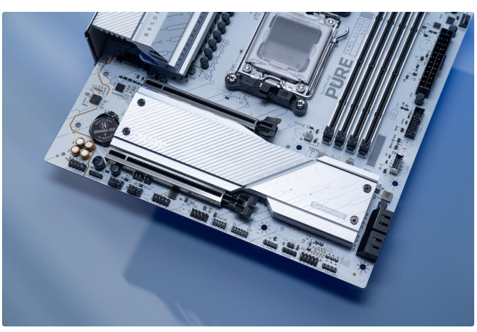 蓝宝石PURE极地B650M WIFI主板隶属于蓝宝石的PURE系列,其外包装正面印有机甲IP形象,比较有科技感。外观设计方面,主板采用了纯白涂装,银色VRM散热片、I/O装甲和SSD散热片做了金属拉丝处理,上面还有科技风格的装饰纹理,主板整体的质感不错,适合用来打造高颜值的白色主机。