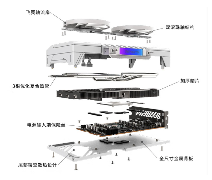 蓝宝石为这款显卡配备了双风扇散热系统,采用双滚珠轴承的飞翼轴流风扇设计,配合3根优化复合热管和加厚散热鳍片,构成了高效的散热解决方案。全尺寸金属背板和一体式框架设计不仅增强了显卡的结构强度,还进一步提升了散热效率。