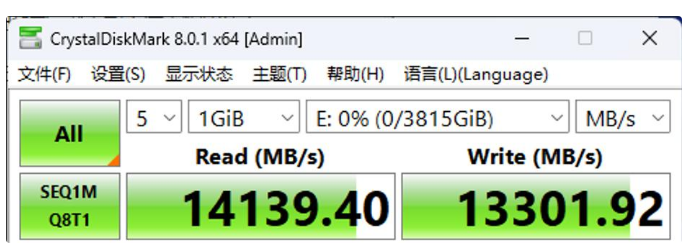 用《CrystalDiskMark》测试佰维X570 PRO 4TB的性能表现,可以看到产品顺序读写速度分别达到了14139MB/s和13301MB/s均达到了官方的宣称数值。表明蓝宝石 NiTRO+ 氮动B850A WIFI主板在PCIe 5.0 M.2 SSD插槽性能上的表现也无可挑剔。