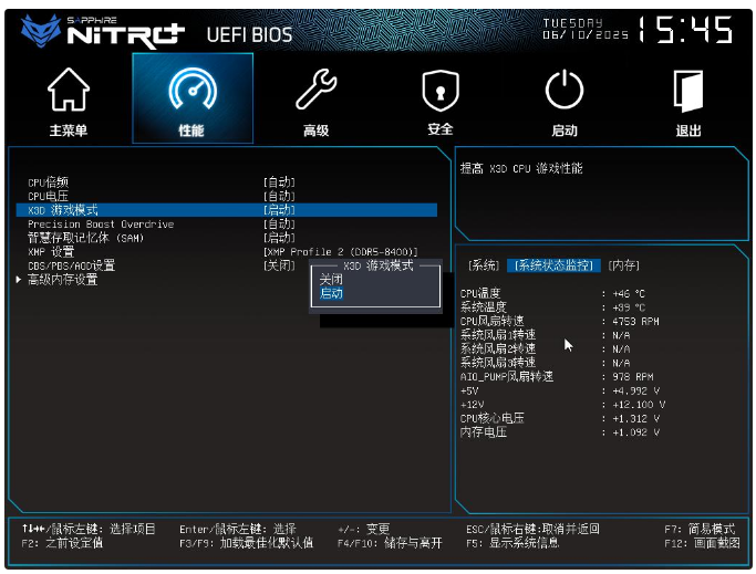 按下F7进行高级模式,主板BIOS的整体功能还是比较的丰富。CPU超频的倍频、电压、PBO等选项一应俱全。值得注意的是蓝宝石 NiTRO+ 氮动B850A WIFI也提供了X3D游戏模式,开启后还能进一步提升X3D处理器的性能表现。另外在性能主界面就能方便地对内存XMP进行设置,进入内存高级设置界面,FCLK频率、UCLK DIV1模式以及时序参数调节等选择都是一应俱全。