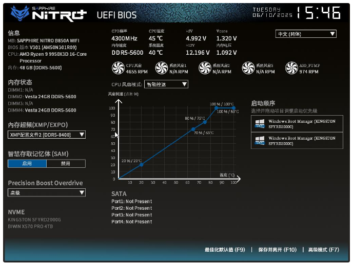 在进入测试前先来看看主板的BIOS。蓝宝石 NiTRO+ 氮动B850A WIFI的BIOS界面为蓝黑主题配色,首次进入之后就是EZ模式,CPU、内存、SSD等硬件的信息一目了然,还有内存超频、PBO功能选项、启动顺序、风扇模式等功能,可以便捷地对电脑系统进行简单的调校。