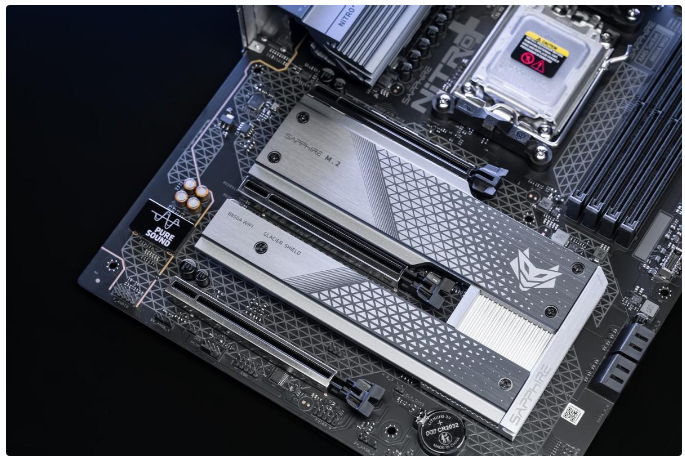 扩展部分,蓝宝石 NiTRO+ 氮动B850A WIFI主板堪称豪华。其配备了3条全长显卡插槽,均覆盖了有金属加固,其中主显卡插槽支持PCIe 5.0×16规格,具备64GB/s的速度,确保最新旗舰显卡发挥全部实力。第2条和第3条插槽分别为PCIe 4.0×4和PCIe 4.0×2规格,与主插槽有足够的距离,不会出现与3槽显卡冲突的情况。