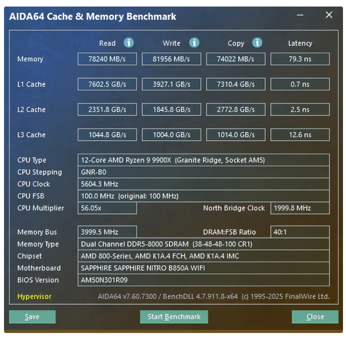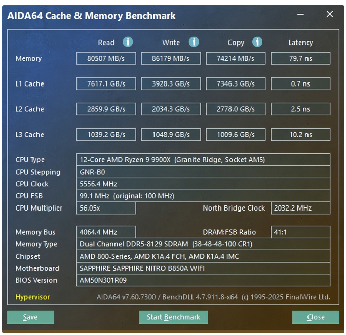 从处理器基准测试和生产力测试软件的成绩来看,锐龙9 9800X3D在蓝宝石 NiTRO+ 氮动B850A WIFI上可以释放出全部性能,与在X8700E上没有区别。毕竟主板拥有高规格的用料和散热配置,取得这样的成绩也完全在我们的意料当中。