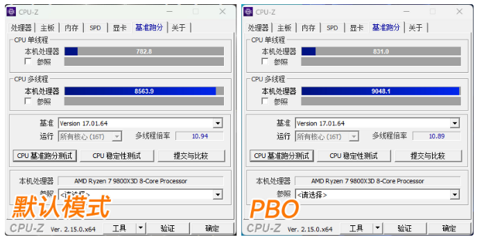 AMD的U开启PBO后可以获得不少性能提升,这里主板搭配9800x3D进行测试,可以看到开启PBO后,CPU-Z跑分从单核782/多核856提升到单核831/多核9048,其中多核成绩突破9000分实属罕见,总体性能提升幅度在5%左右。