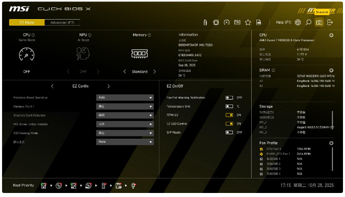 微星B850MPOWER的BIOS也做了定制主题,整体界面非常清爽,左上角可以快速开启Game Boost游戏模式、NPU AI Boost、内存EXPO,下方EZ Config有自动PBO选项、Memory Try It!预设超频选项、X3D Gaming Mode等,新机大部分需要设置的选项都可以一键开启。